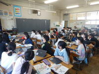 5時間目。2-2の教室訪問は学級活動です。第1回目の学級会を参観しました。今日の議題は、「みんなで遊ぶ日を決めよう」めあては「みんなが楽しめる遊びを考えよう」です。学級会ノートにそれぞれの考えを書き、担任の先生に花丸をもらったりして話合いに向けた準備は万全です。25分休みか昼休みどちらでしたいかについては、「給食の後だと、食べ終わっていない人がいるかもしれない」「25分休みの方が長く遊べる」などの意見が出ており、「いいね!」「よし!」と気持ちが前向きになっていく様子が伝わってきました。話合いのルールを司会の児童に確認される場面もありました。気持ちの良い話合いができるよう、聞き方、話し方を身につけ、これからも学級会に取り組んでいきます。