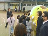 後半、校庭にはゾウキリンが登場!児童が駆け寄っていきますが、ハンターにゾウキリンがつかまってしまったという設定です。ハンターの背中に書いてある文字を集めてゾウキリンを助け出すミッションが与えられました。安全ゾーンにこもってしまう児童もいますが、果敢にハンターの背中の文字を調べに行く児童もたくさんいます。文字を組み合わせたキーワードが分かった児童が報告に行きゾウキリンの救出を行っています。