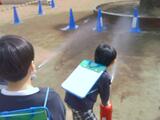 体験をするグループは煙ハウスと水消火器です。煙が充満した部屋に入ると煙で前が見えません。「前が見えない!」「煙が甘い!」と、マスクやハンカチで口を押さえていても煙を吸い込んでしまうことを体験しています。水消火器ではしっかりホースの先を持って、火元に向けて消火器を使うことを覚えました。でも、一番は大人に助けを求めることが大事だと教えていただきました。
