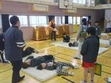 ひとつ目のグループは、搬送方法を教えていただいています。動けなくなった人をどのように避難させればよいのか。助ける側の人数によって、搬送の方法が変わります。担架が無くても手の組み方、足の持ち方をしっかり覚えれば、2人で1人を運べる…はず。力が足りなくて消防士さんに助けてもらうグループもありましたが、コツをつかんで安全な搬送が行えるようになるグループもありました。